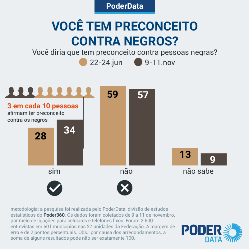 A realidade está aí. Pesquisa PoderData mostra que 81% dos brasileiros dizem haver preconceito contra negros no Brasil por causa da cor da pele. Só para apenas 13% da população, o racismo não existe no país. Só que quando se pergunta “Você diria que tem preconceito contra pessoas negras?”. O resultado do levantamento mostra que 34% dos brasileiros afirmam que sim, consideram ter preconceito contra negros. É muito difícil admitir o racismo incutido em todos nós o que gera uma sensação falsa de democracia racial.